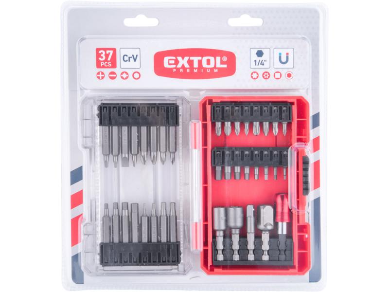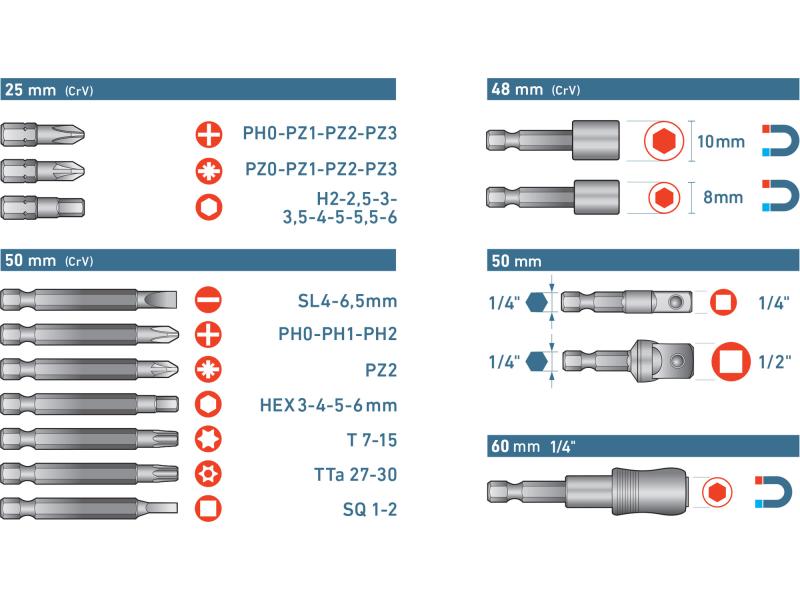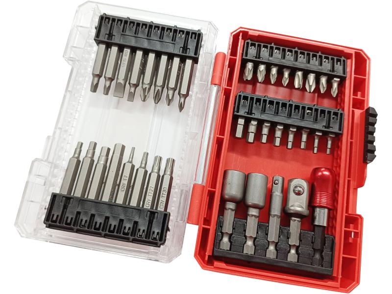 behajtó klt. 37 db Cr.V., lapos, PH, PZ, HEX, TTa, SQ, dugófej, bittartó szár, műanyag tartóban