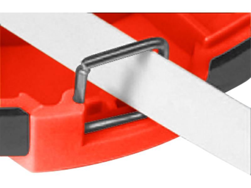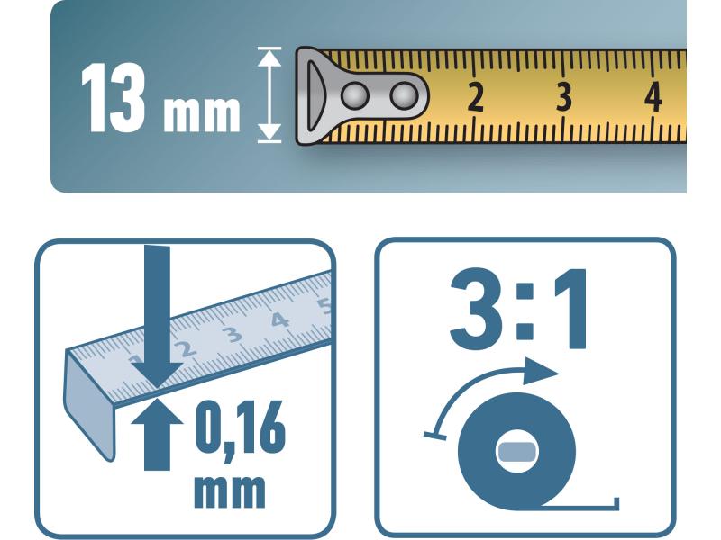 ABS műanyag ház, csúszásgátló TPR gumis részekkel. Bevonatos fém szalag, 0,16mm vastag. CE, Class II. Belső áttétel: 3:1, a gyorsabb felcsévélés érdekében.