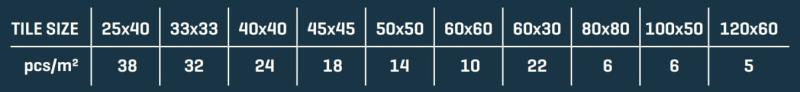 A képen mellékelt táblázat az adott méretű csempék egy négyzetméteréhez szükséges minimális szintező talpak darabszámát mutatja.